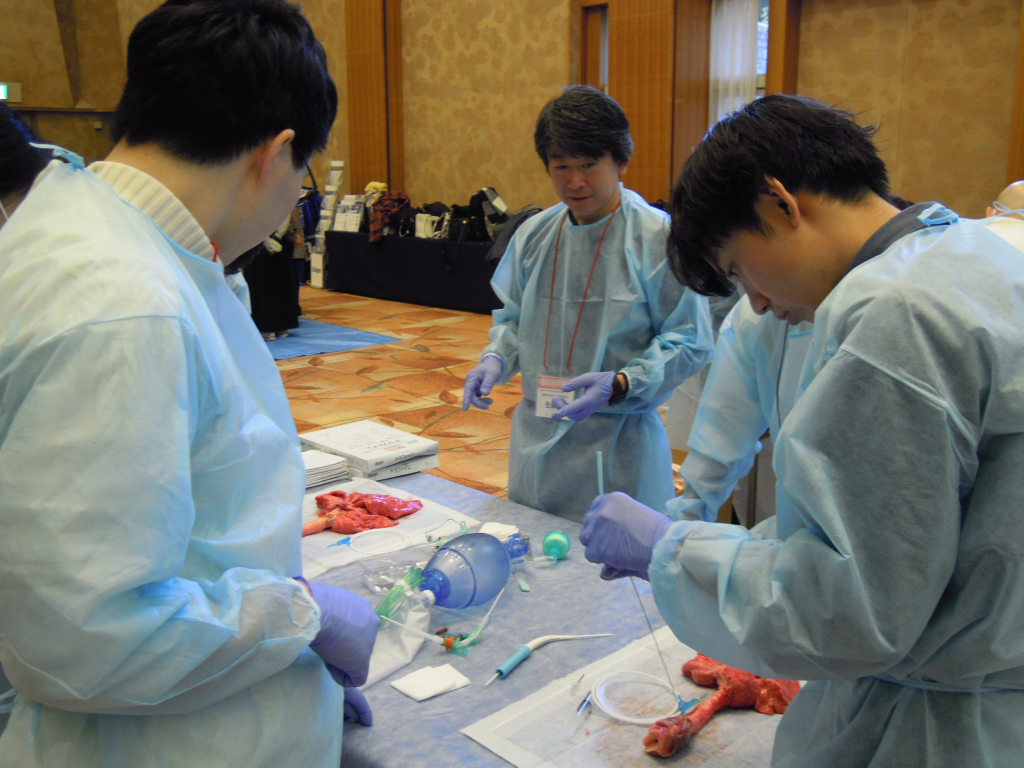 ブタ気管で3種類の方法で外科的気道確保を実践し、ブタ心臓で実際に解剖を行い、