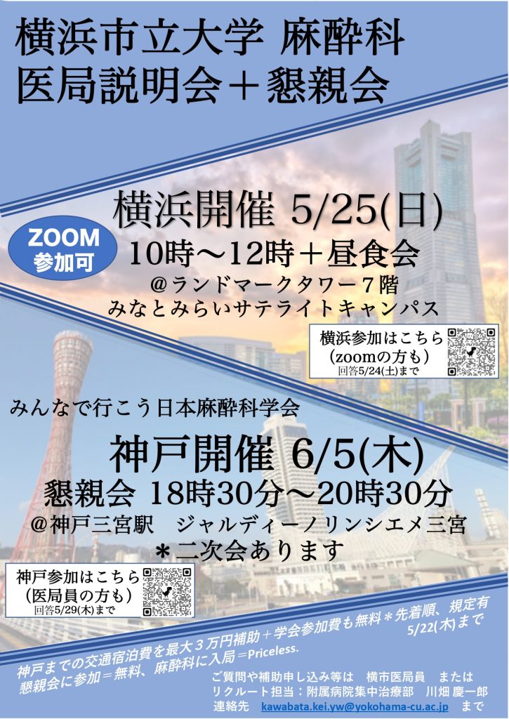 *遠方開催につき交通費、宿泊費等に対して医局より最大3万円補助させて頂きます。(先着順・規定有) 詳細確認と補助申請はリクルート担当 川畑(kawabata.kei.yw@yokohama-cu.ac.jp)または横市医局員までお問い合わせください。(期限:5/22(木)まで)