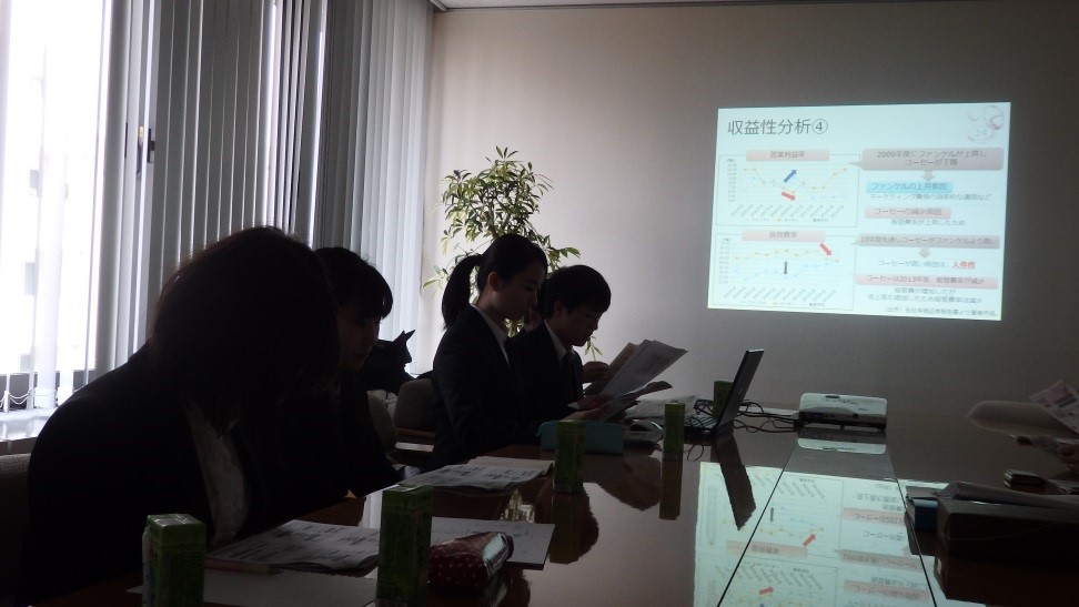 2016年1月6日にファンケル本社を訪問しました。株式会社ファンケルを分析するという活動は、昨年4月より始め、 7月の財務報告研究会、9月の夏合宿などを通じて先生、OB・OGからアドバイスを受けながら分析を深めてきました。 具体的な内容としては、財務諸表を用いて財務分析を行うとともに、業界の特徴や企業の経営戦略・企業価値も含めて分析し、最後に企業の今後の展望についての考察を行いました。 当日は、私たちの分析内容をファンケルの方に見て頂くことで、企業の視点も交えたより深い分析を行うという目標のもと、 中條先生と学生5名(4年生2名、3年生1名、2年生2名)が訪問しました。初めに、ゼミ生による分析内容の発表を15分行い企業の方より45分程フィードバッグをいただきました。 訪問を通して、アナリストレポートの意義や役割等、実務を踏まえたご助言をいただき、視野が広がりました。 その他にも、普段の活動では得られない経験をさせていただきました。お忙しい中訪問を受け入れて下さり、 貴重なお話をお聞かせいただいたファンケルの皆様、ありがとうございました。 特に、中期経営計画や有価証券報告書などを文字で読むのと実際に社員の方からお聞きするのでは、印象が変わりました。 分析において、数字や資料を用いた分析と合わせてその背景を探るために、実際に企業の担当者の方にお話を聞く事は大変有益でした。フィードバッグをいただいたことを参考に、より深い分析に努めてまいります。