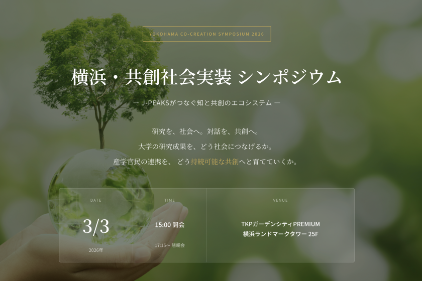 Post Share Hatena Line RSS feedly Pin it note 横浜・共創社会実装 シンポジウム— J-PEAKSがつなぐ知と共創のエコシステム —を開催いたします。 詳細はこちらから:https://www-user.yokohama-cu.ac.jp/~fshaping/3248-2/ 横浜未来実装(YOKOHAMA FUTURE SHAPING)in YOXO FESTIVAL 2026 前の記事