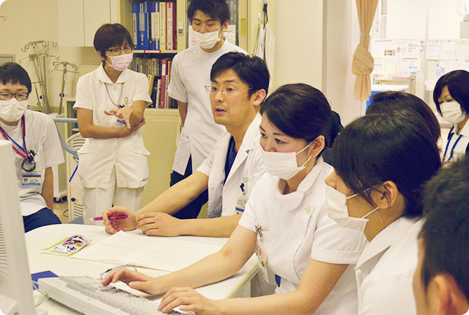 看護職に対して、救急看護の質の向上を目指し、緊急度・重症度を判断するための的確なフィジカルアセスメント、救命に必要な技術・知識の指導及びコンサルテーションを行います。