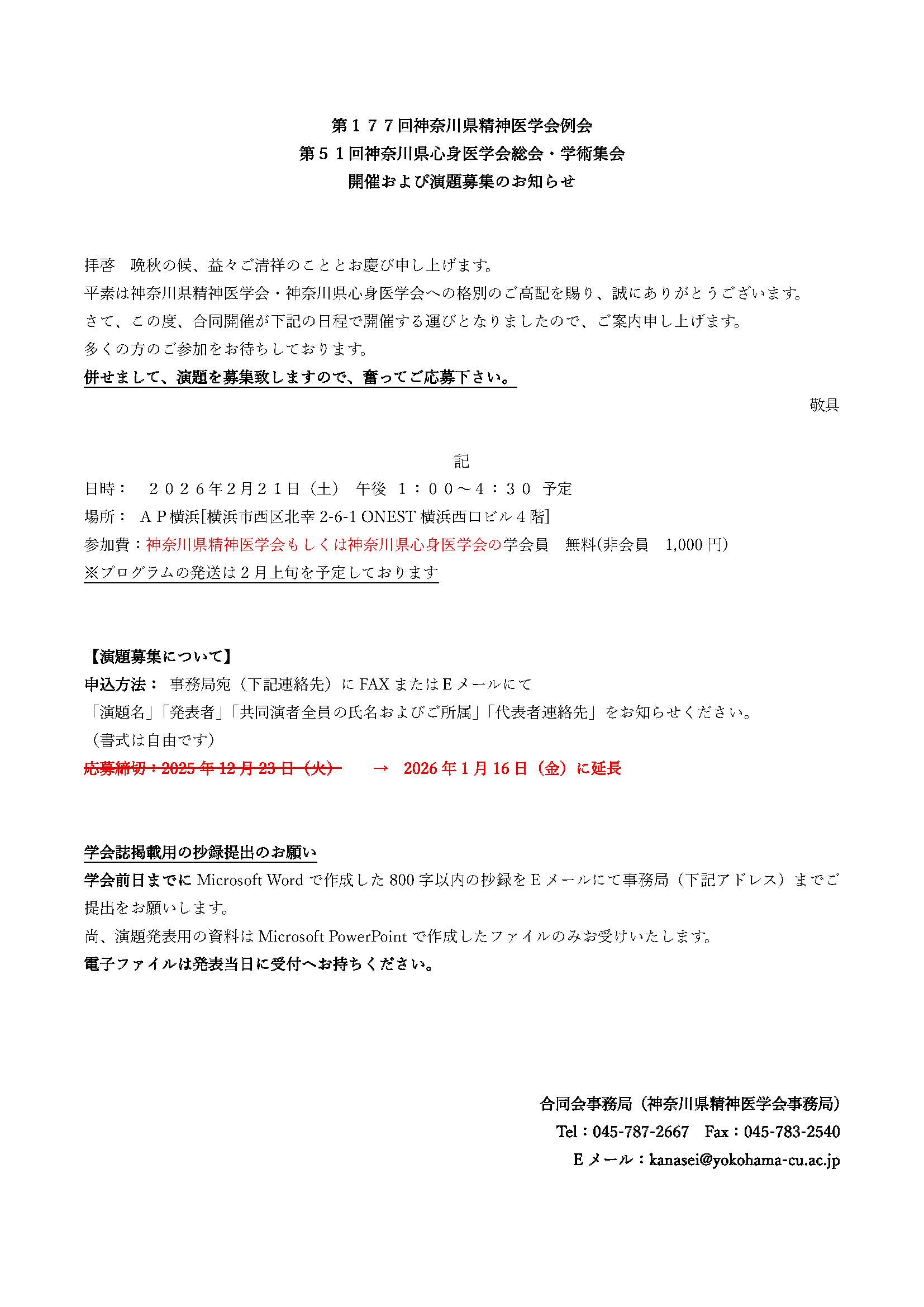 第177回神奈川県精神医学会第51回神奈川県心身医学会 演題募集(募集期間延長)のお知らせ